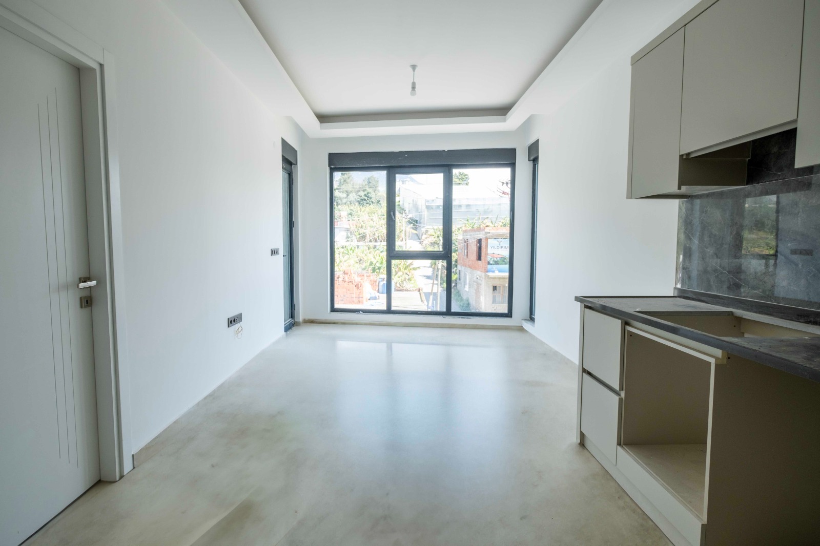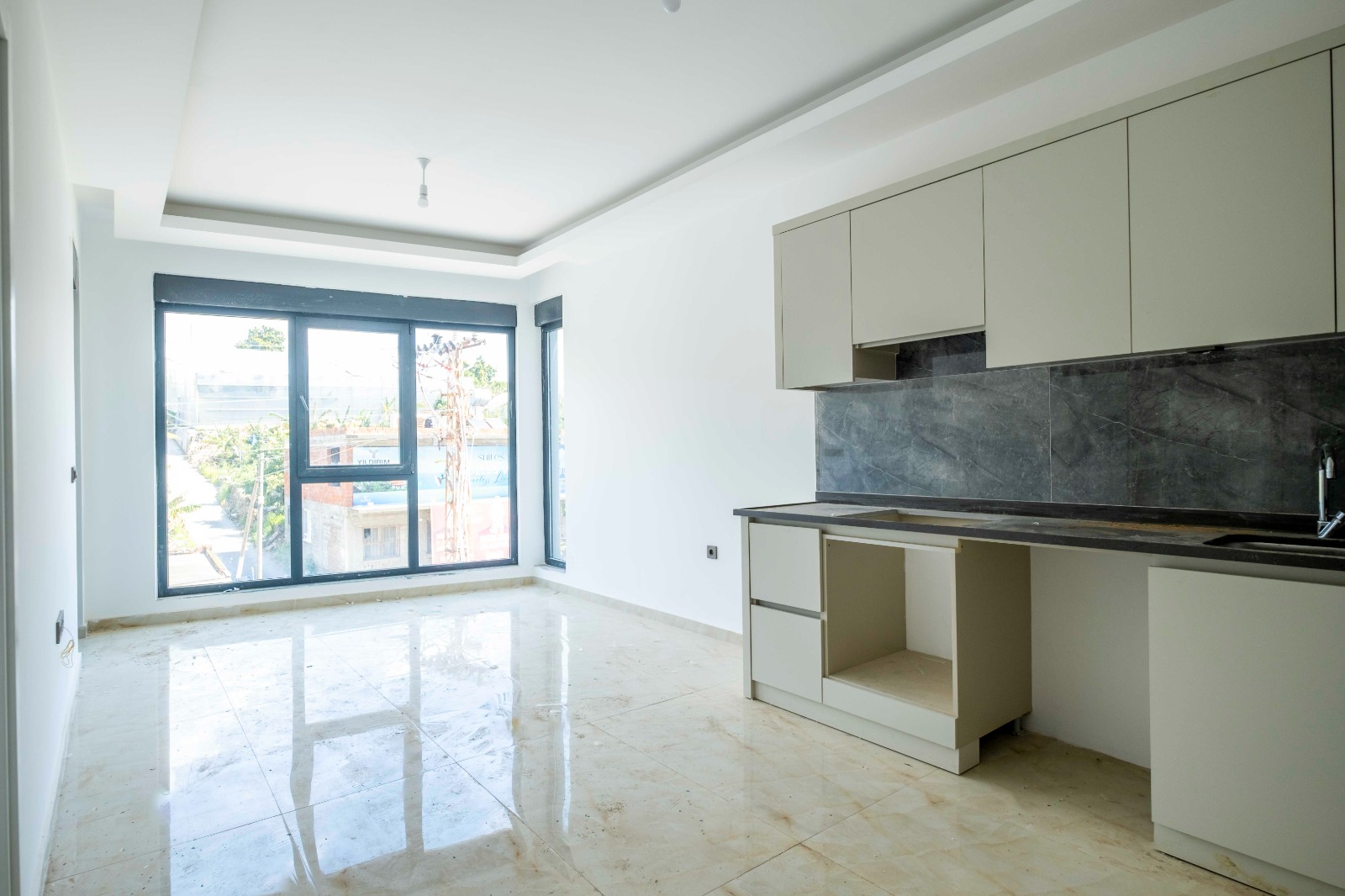 Продается квартира планировки 1+1 в новом современном комплексе Uyaroglu Residence. Квартира расположена на 1 этаже 5-этажного дома и состоит из спальни, гостиной, совмещенной с кухней, санузла и балкона. Общая площадь квартиры- 52 м2.
