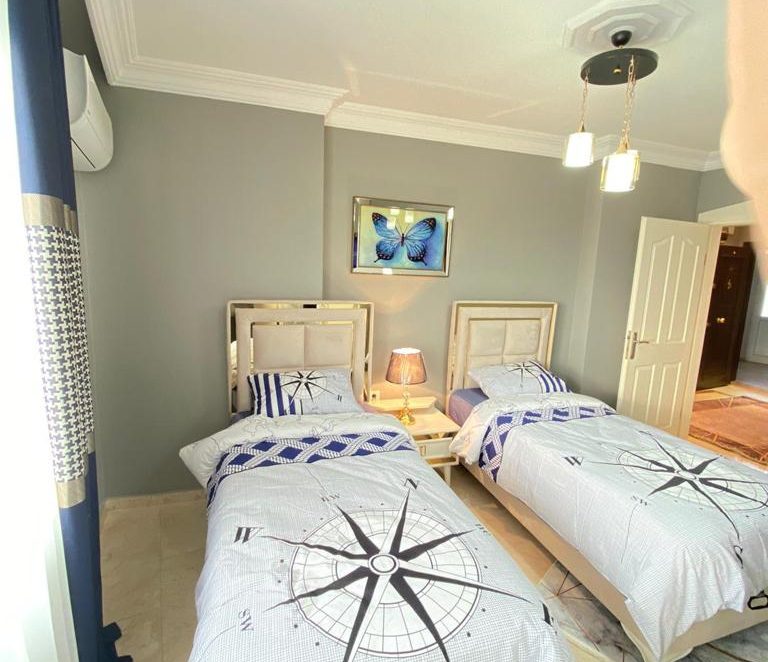 Апартаменты площадью 110 м² расположены на 6 этаже. Планировка 2+1 включает две отдельные спальни, гостиную, полностью оборудованную кухню и санузел. Квартира полностью меблирована. Два балкона с юго-западной ориентацией обеспечивают прекрасное естественное освещение и вид на море.