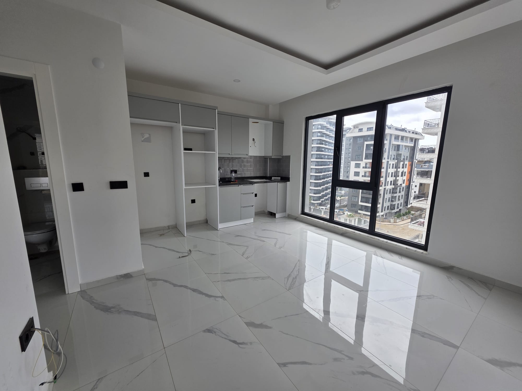 Квартира 1+1 с общей площадью 52 м² расположена на 5 этаже. Современная чистовая отделка, панорамные окна. Просторная гостиная, объединенная с кухней, отдельная спальня и современный санузел.