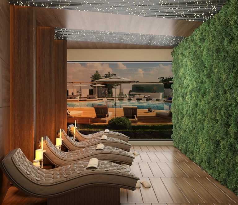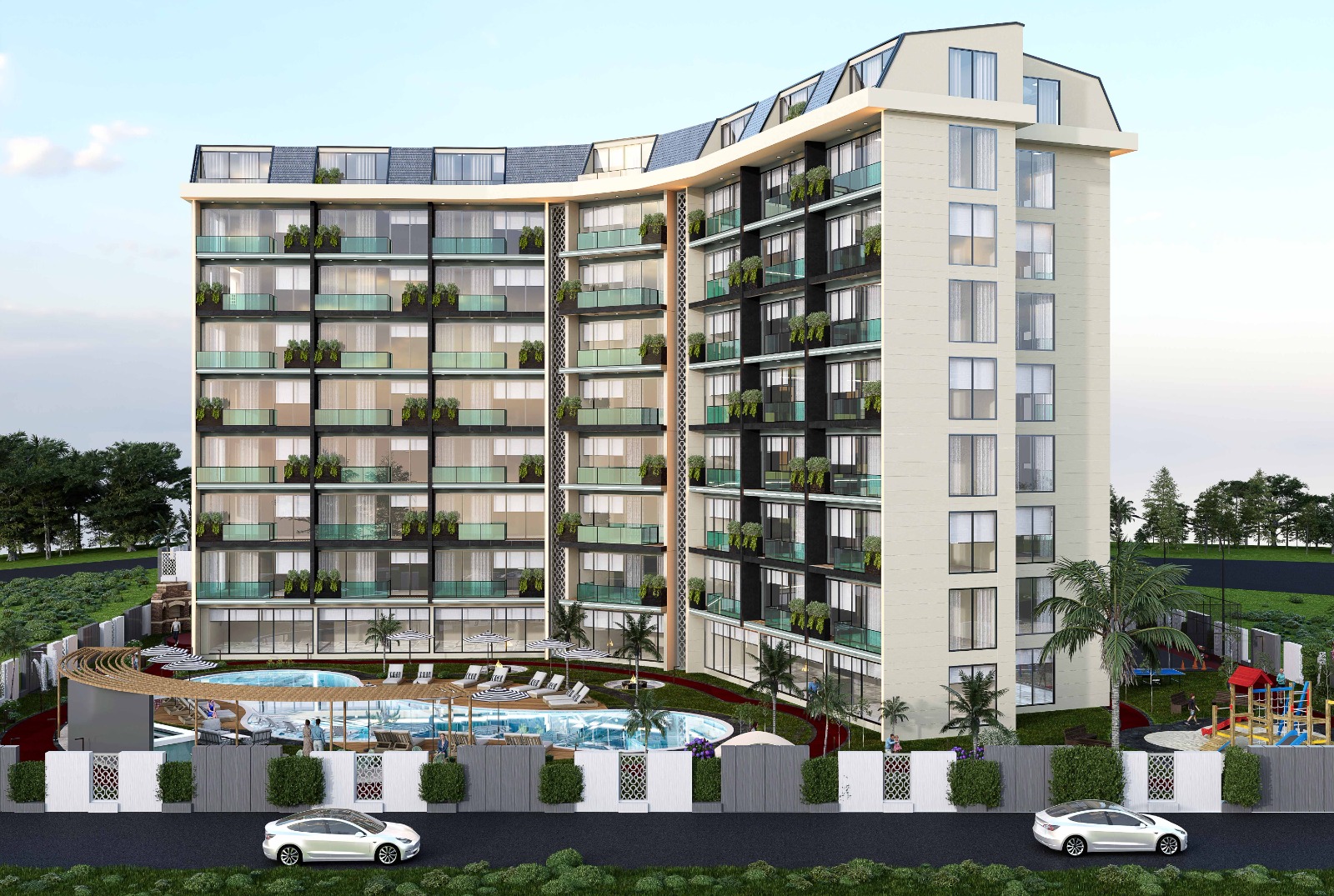 На территории комплекса предусмотрено всё необходимое для комфортной жизни — открытый бассейн, детский бассейн, фитнес-зал, сауна, зоны отдыха, лифт, парковка, видеонаблюдение, благоустроенная территория 🌴.