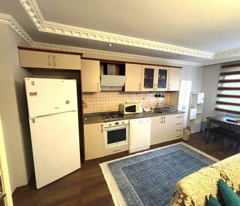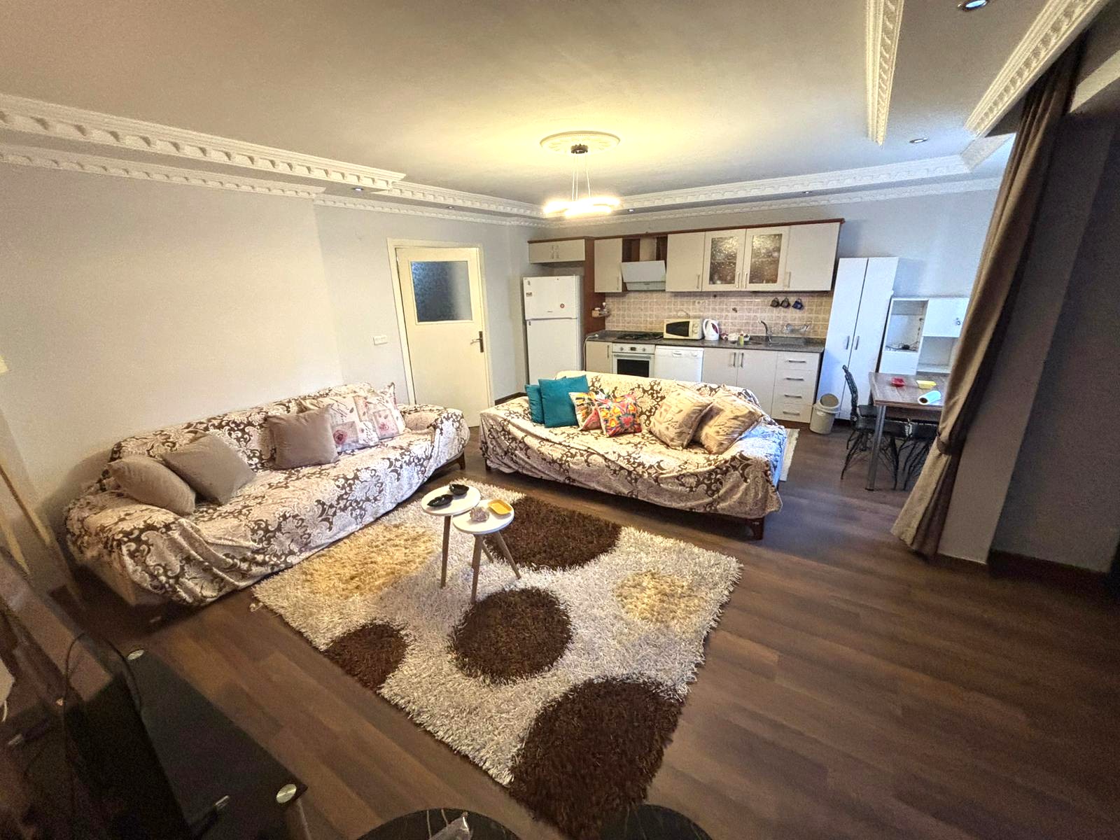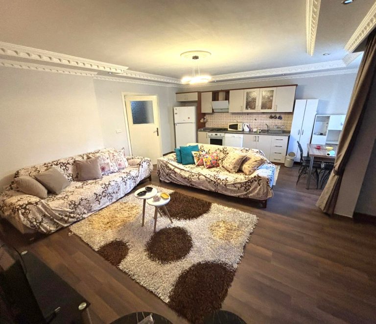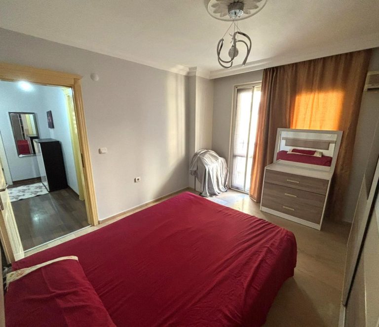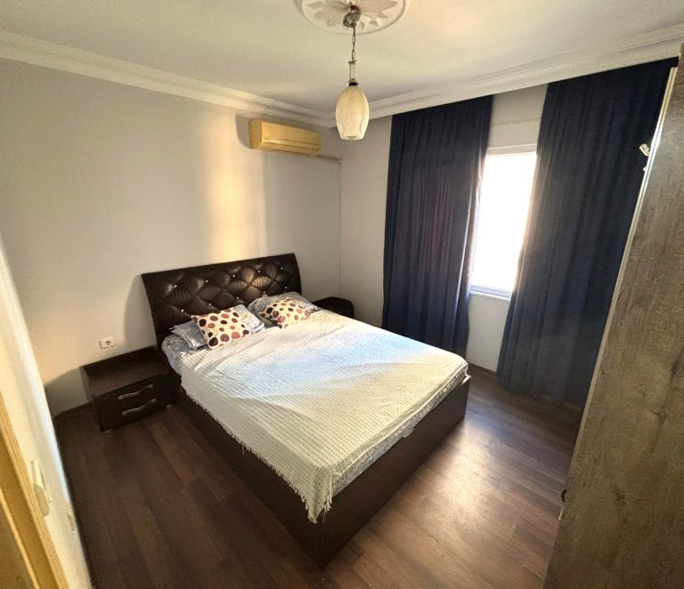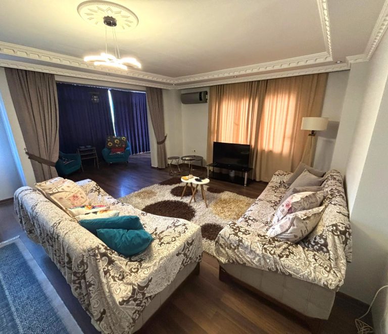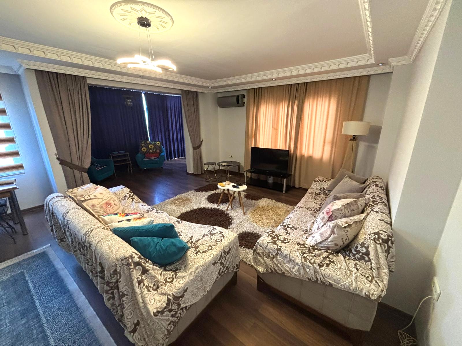 Квартира полностью меблирована и готова к заселению. Площадь 115 м² позволяет комфортно разместить семью или компанию гостей. Планировка 2+1 включает две отдельные спальни, гостиную, кухню и санузел. Из окон открывается вид на территорию комплекса.
