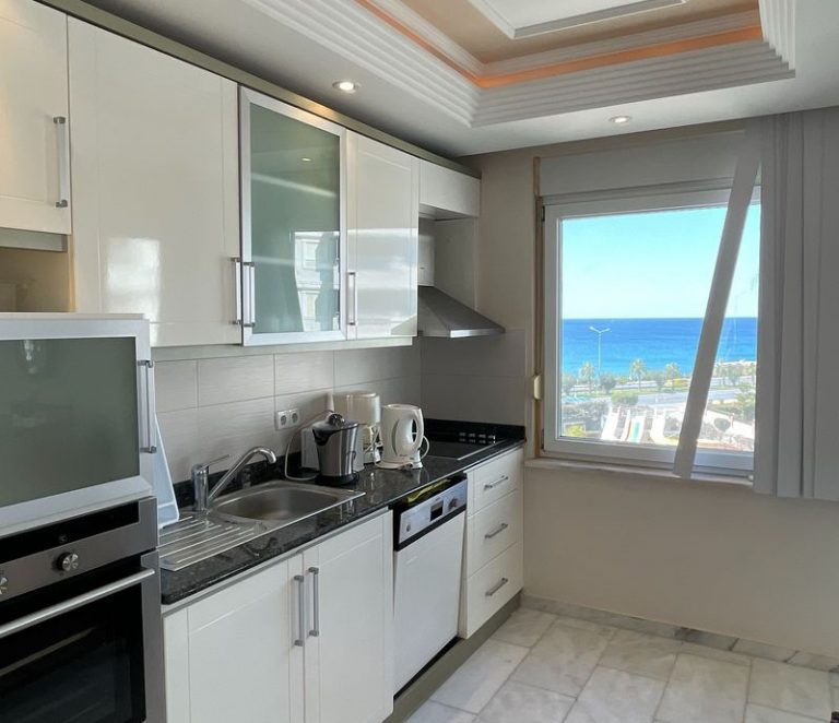 Квартира площадью 125 м² имеет планировку 2+1, что подразумевает две спальни, гостиную и отдельную кухню. Объект полностью меблирован и готов к заселению. С верхних этажей, включая 5-й, открывается прекрасный вид на море и город.