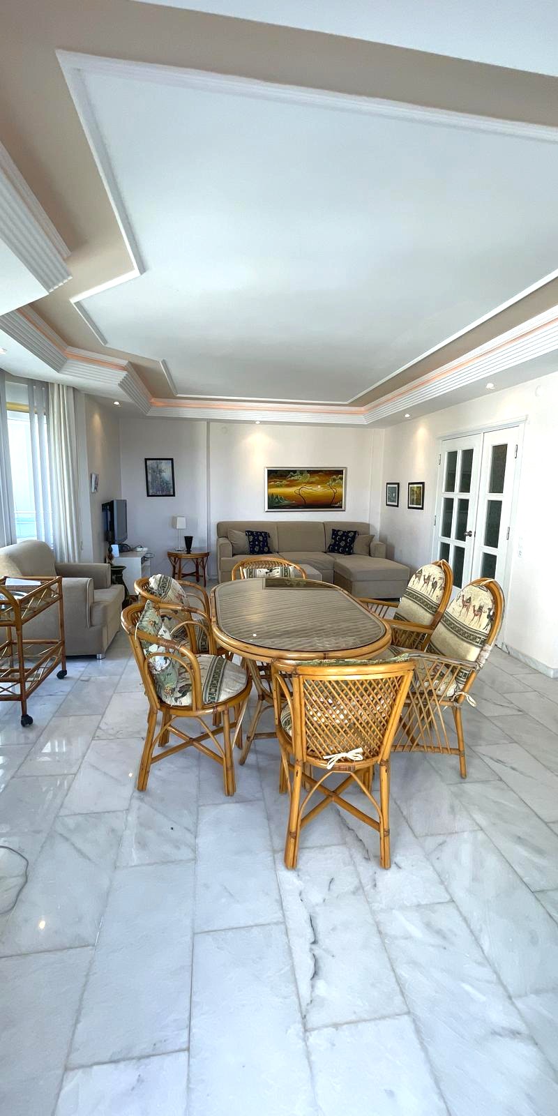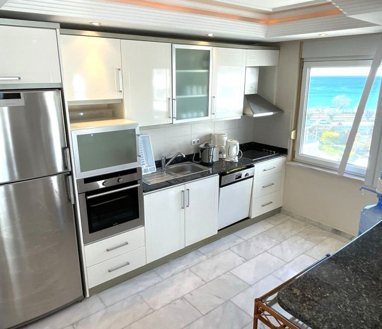 Квартира площадью 125 м² имеет планировку 2+1, что подразумевает две спальни, гостиную, кухню и санузел. Объект полностью укомплектован качественной мебелью и бытовой техникой. С пятого этажа открывается живописный вид на море и городскую панораму.