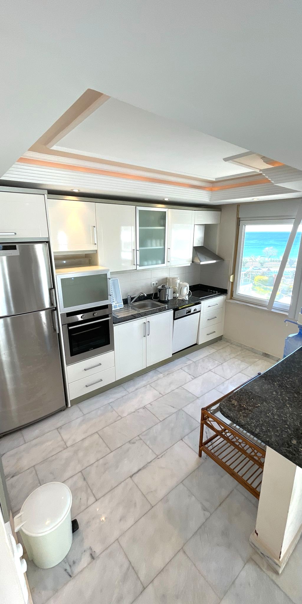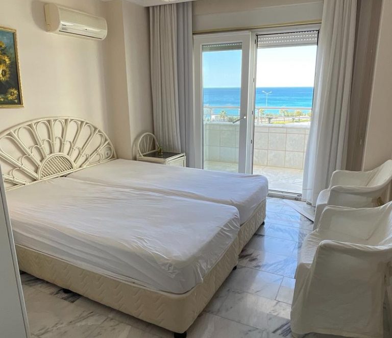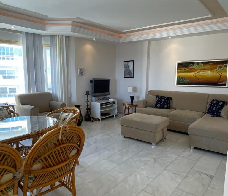 Квартира площадью 125 м² имеет планировку 2+1. Из жилых помещений открывается совмещенный вид на море и город. Объект полностью укомплектован качественной мебелью и бытовой техникой, что позволяет заселиться сразу после покупки.