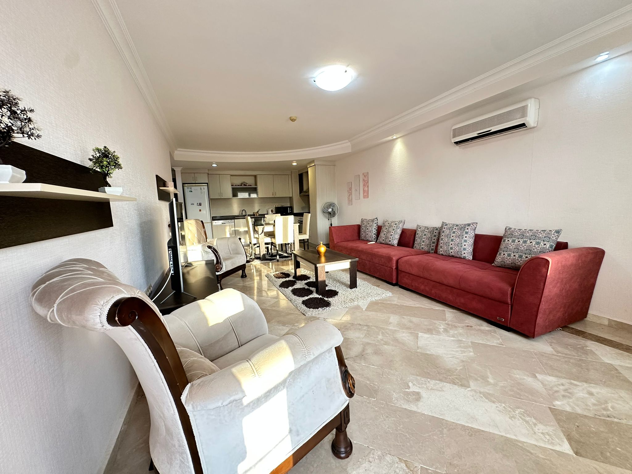 Просторная двухкомнатная квартира 2+1 площадью 129 м² на высоком этаже в современном комплексе с развитой инфраструктурой. Идеальный вариант для комфортного проживания у моря или выгодной инвестиции.