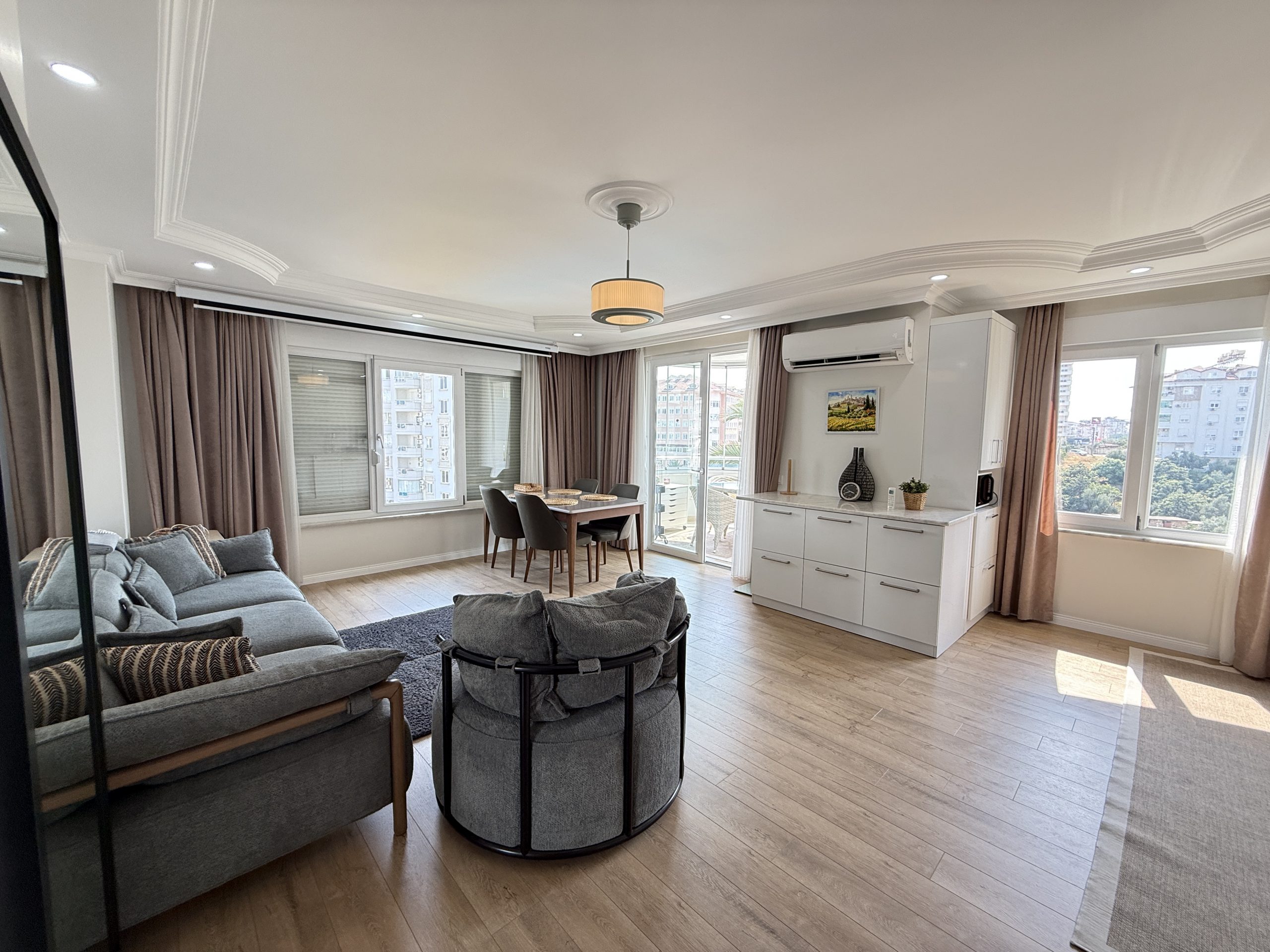Квартира площадью 115 м² имеет практичную планировку 2+1: две спальни, гостиная, кухня и санузел. Панорамные окна обеспечивают хорошее естественное освещение. Отделка выполнена в современном стиле.