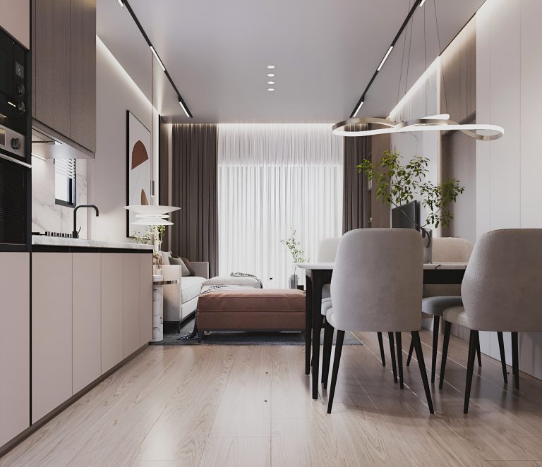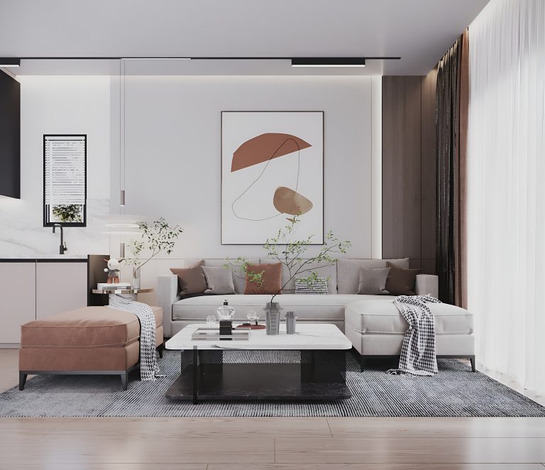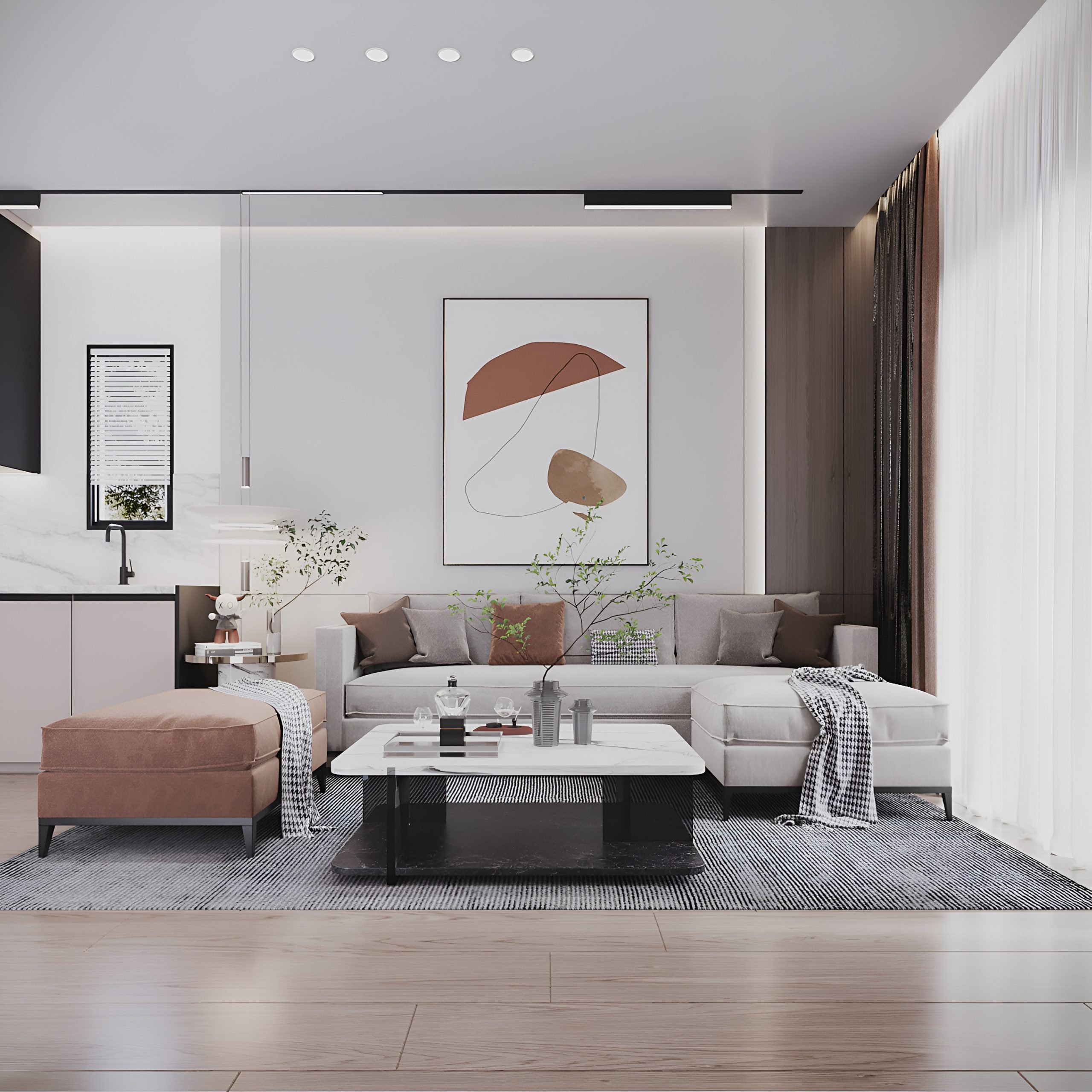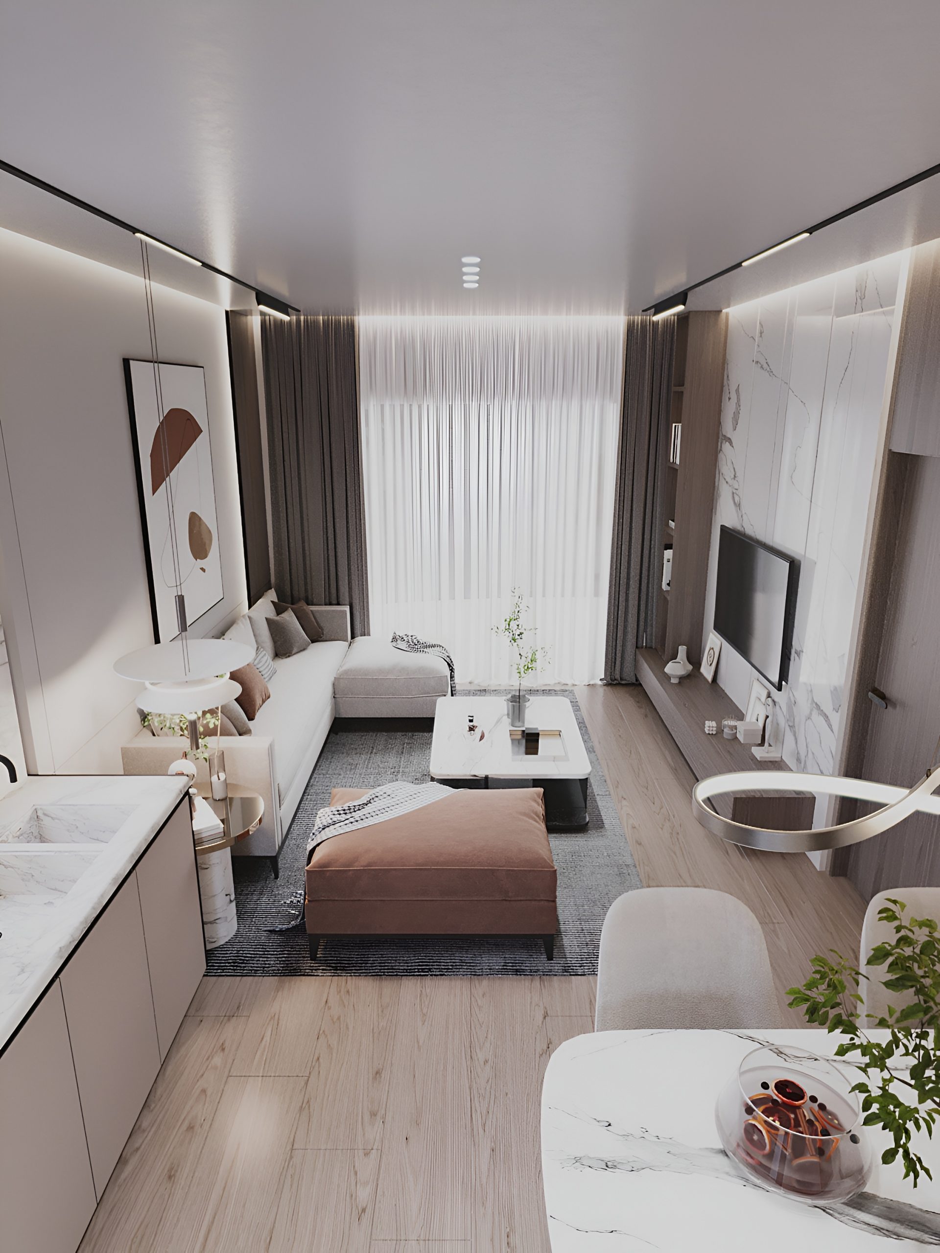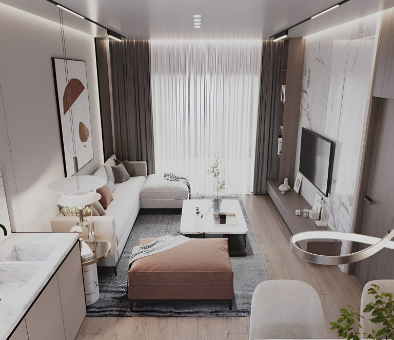 Апартаменты площадью 83 м² спроектированы с акцентом на функциональность и удобство. Просторная гостиная объединена с кухонной зоной, создавая единое светлое пространство для отдыха и общения.