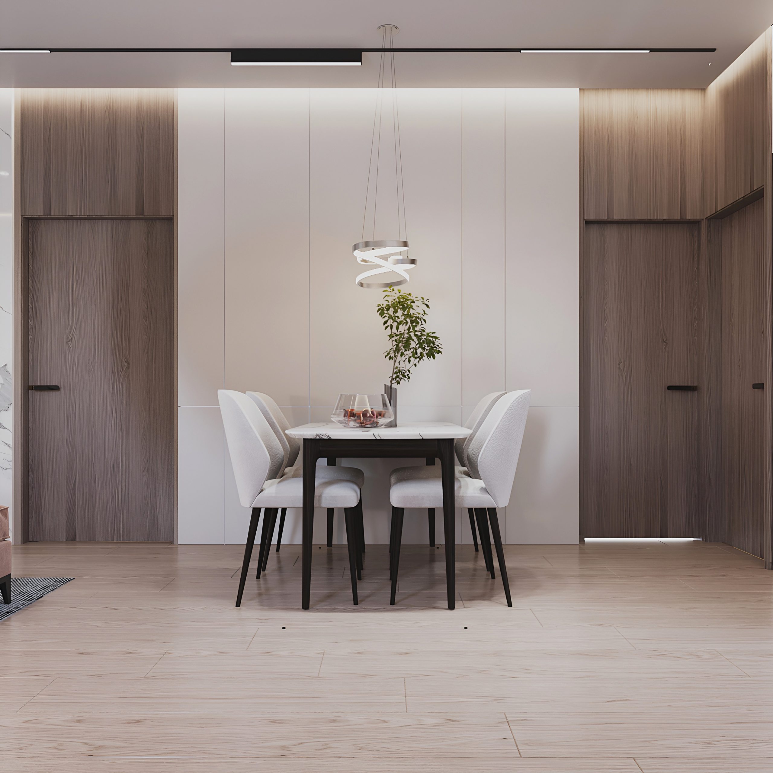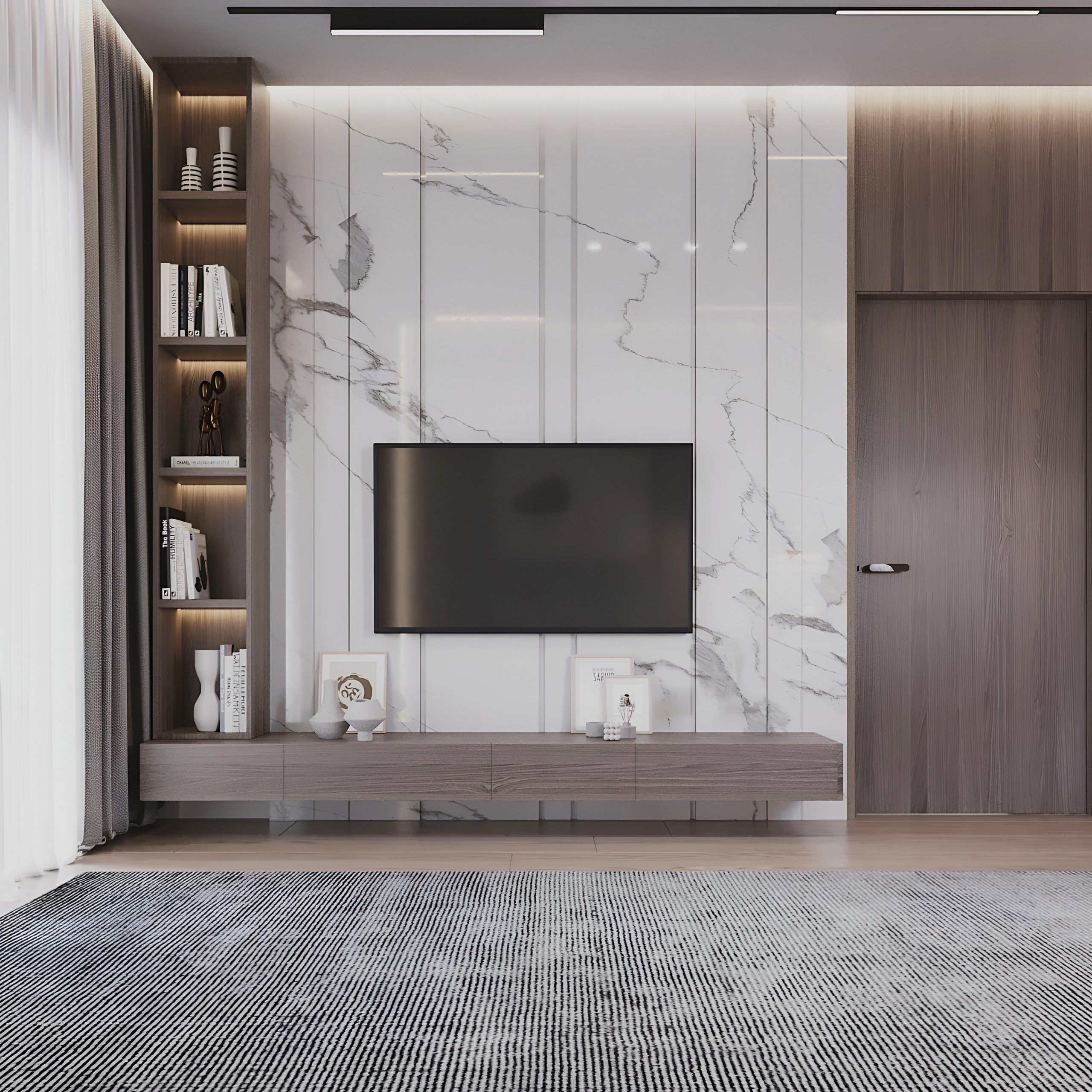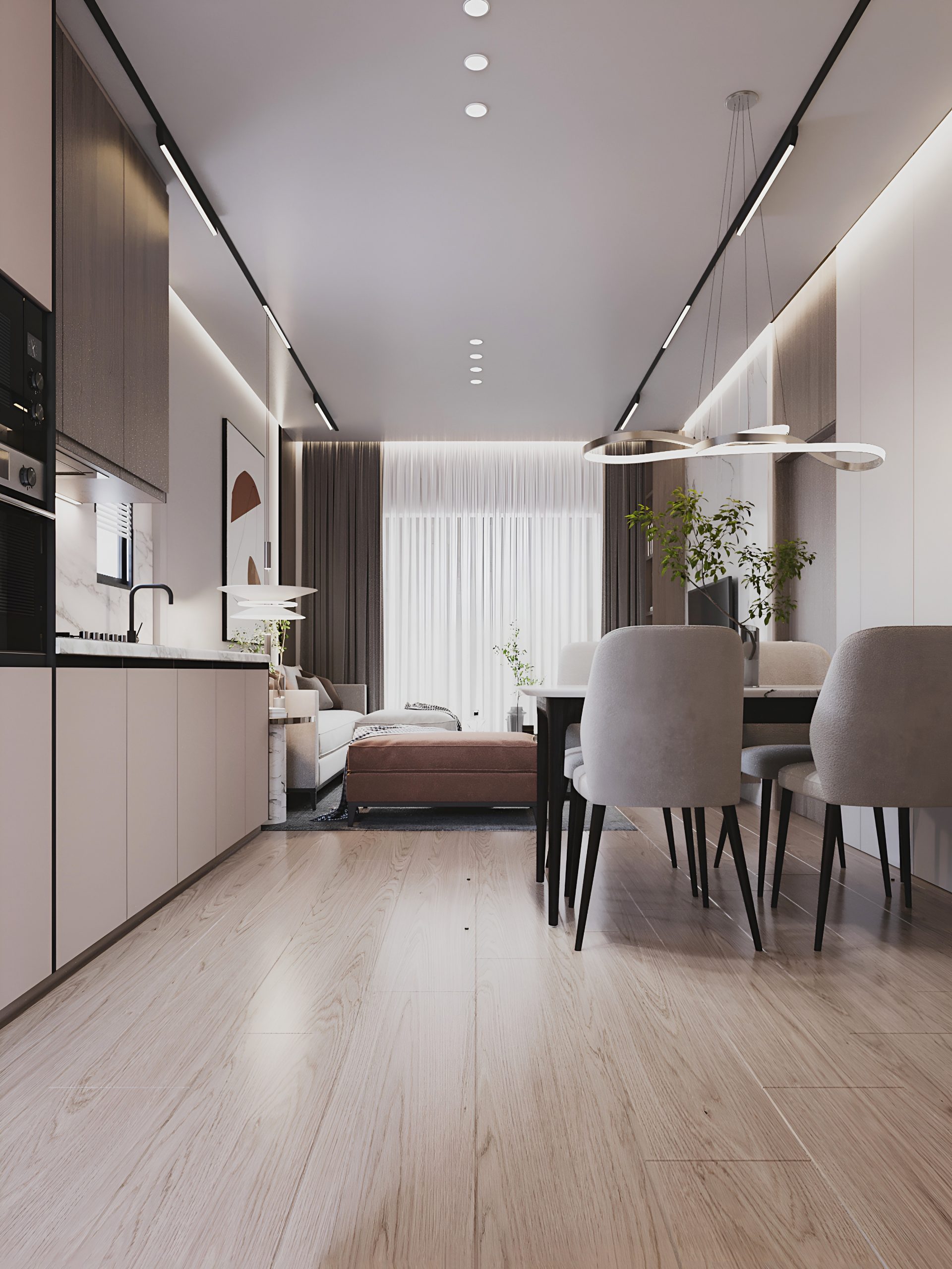 Апартаменты площадью 83 м² спроектированы с акцентом на функциональность и удобство. Просторная гостиная объединена с кухонной зоной, создавая единое светлое пространство для отдыха и общения.