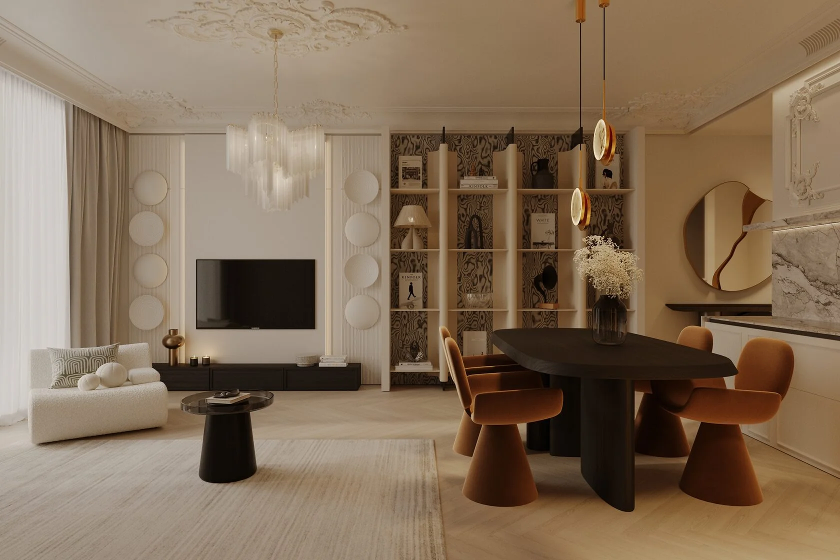 🍽 Кухня-гостиная с обеденной зоной — просторное сердце квартиры, объединяющее кулинарию, уют и вид на море.