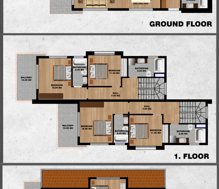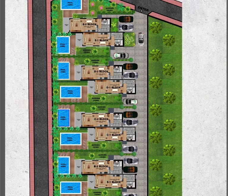 Продаются трехэтажные виллы планировки 4+1 в строящемся комплексе вилл Elegant Lavinia Villa в районе Авсаллар, пригорода Алании. В каждой вилле есть холл, две гостиные американского типа( на 1 и 3 этажах), три спальни, четыре санузла, балконы и терраса с выходом в собственный сад с частным бассейном. Общая площадь виллы —220 м2.